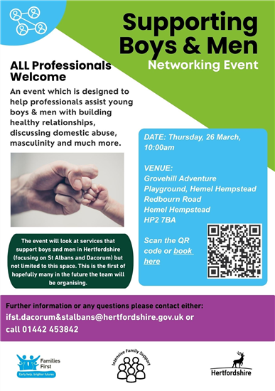 Our St Albans and Dacorum Intensive Family Support Team are hosting an event which is designed to help professionals assist young boys & men with building healthy relationships, discussing domestic abuse, masculinity and much more. All professionals are welcome to come along, please register your place here:- Men's Networking Event | Hertfordshire County Council. The event will look at services that support boys and men in Hertfordshire (focusing on St Albans and Dacorum) but not limited to this space. This is the first of hopefully many in the future the team will be organising.